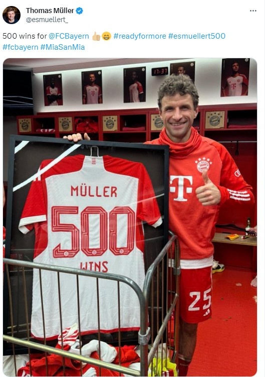 穆勒赛后在社媒中晒出他和500胜纪念球衣的合照,并且写道:“为拜仁取得的第500场胜利