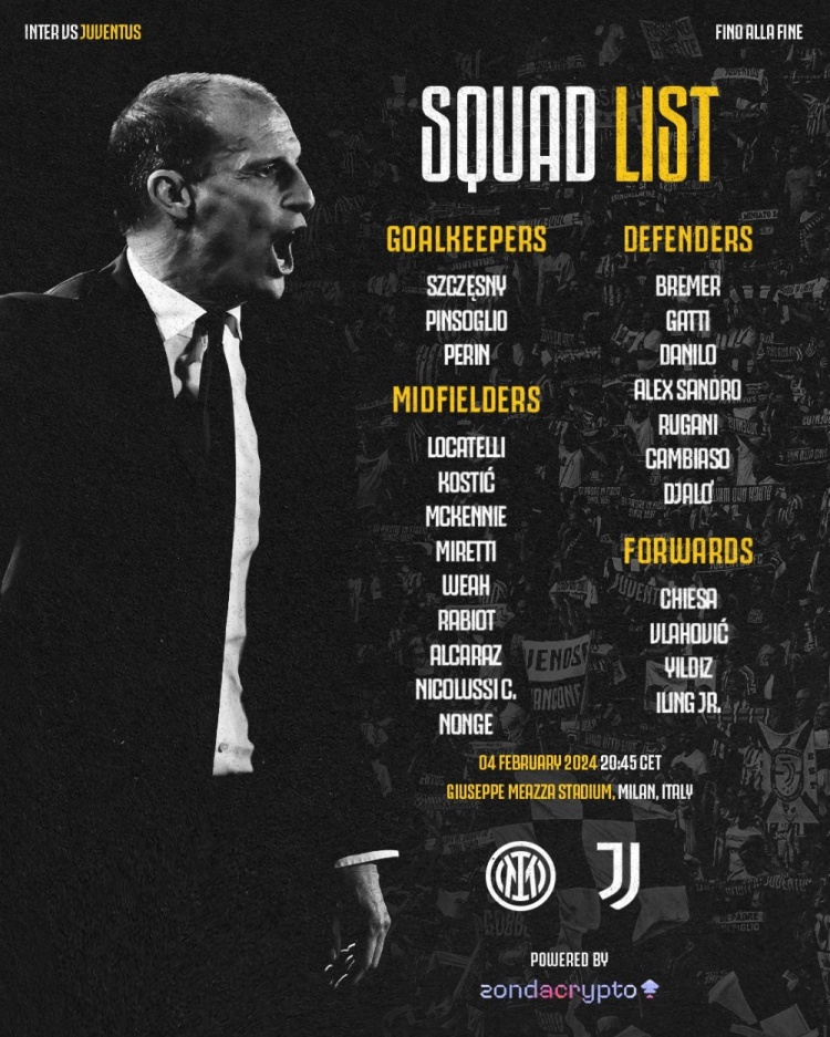 2月4日讯 尤文官方公布了意大利国家德比的球员大名单,弗拉霍维奇领衔,新援阿尔卡拉斯在列。