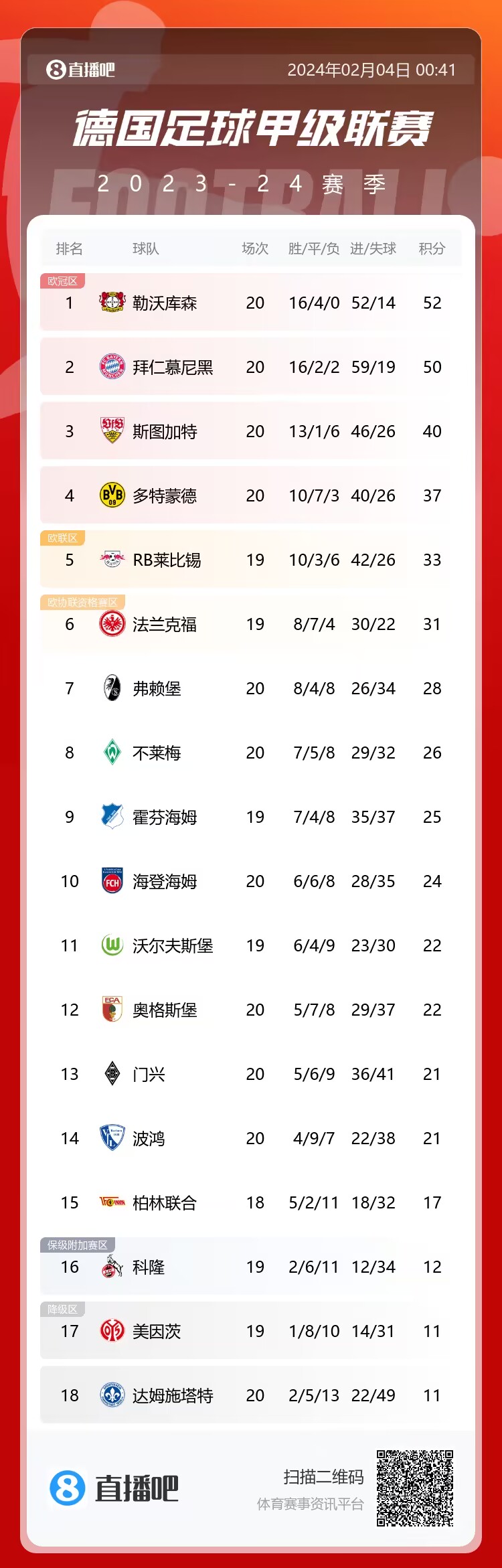 2月4日讯 德甲第20轮,勒沃库森2-0达姆施塔特,拜仁3-1门兴。目前积分榜上,勒沃库森16胜4平不败居首,拜仁赢球仍距榜首2分。下一轮两支球队将正面对决!德甲积分榜