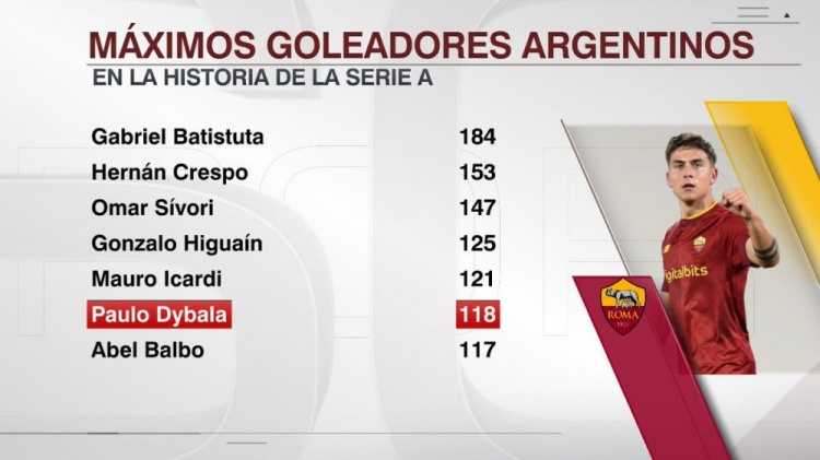 2月6日讯 在意甲第23轮比赛中,迪巴拉梅开二度,帮助罗马主场4比0大胜卡利亚里。ESPN统计了阿根廷球员在意甲的进球数量,并列出榜单,巴蒂以184球居首,迪巴拉以118