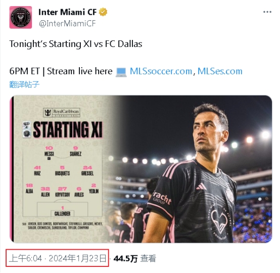 4-迈阿密国际vs达拉斯FC,开球时间为早上7点,官方提前56分钟公布首发