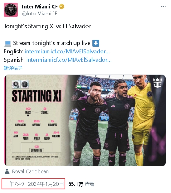 5-迈阿密国际vs萨尔瓦多,开球时间为早上9点,官方提前1小时11分钟公布首发
