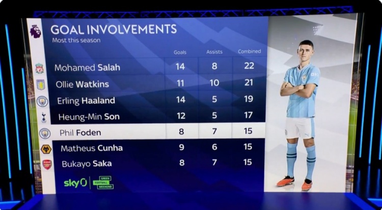 2月6日讯 天空体育统计了球员本赛季在英超参与进球的数量,并列出榜单,萨拉赫以22球居首,哈兰德以19球排名第三,本轮戴帽的福登以15球升至并列第5位。