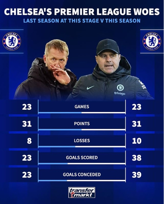 2月6日讯 德转统计了本赛季切尔西与上个赛季同期的数据,23轮过后切尔西本赛季的积分与上赛季同期相同。
