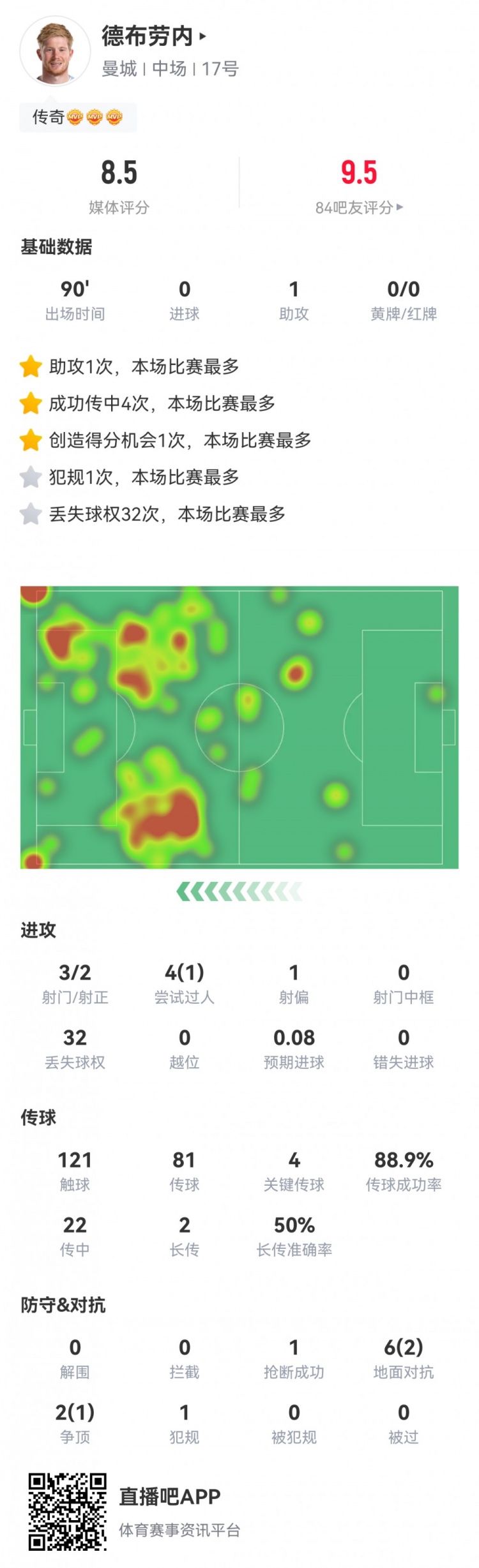 德布劳内本场数据:1次助攻,4次关键传球,获评8.5分