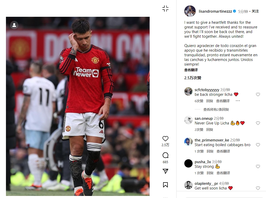 2月6日讯 曼联官方宣布复出仅4场的利桑德罗-马丁内斯膝盖内侧副韧带受伤,至少缺席8周。球员本人更新社媒发文致谢球迷。