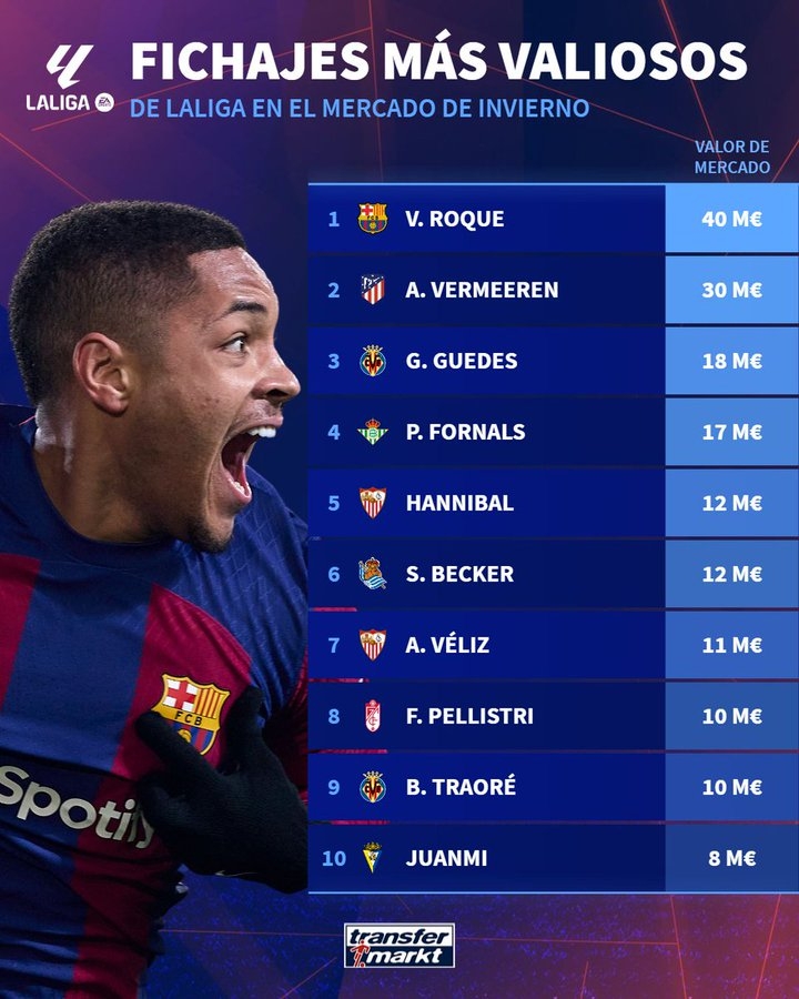 2月6日讯 德国转会市场盘点了本次冬窗西甲的引援排行榜,其中罗克以4000万欧元的价格居首。具体排名如下:1、罗克(巴萨)4000万欧2、费尔梅伦(马竞)3000万欧3、格