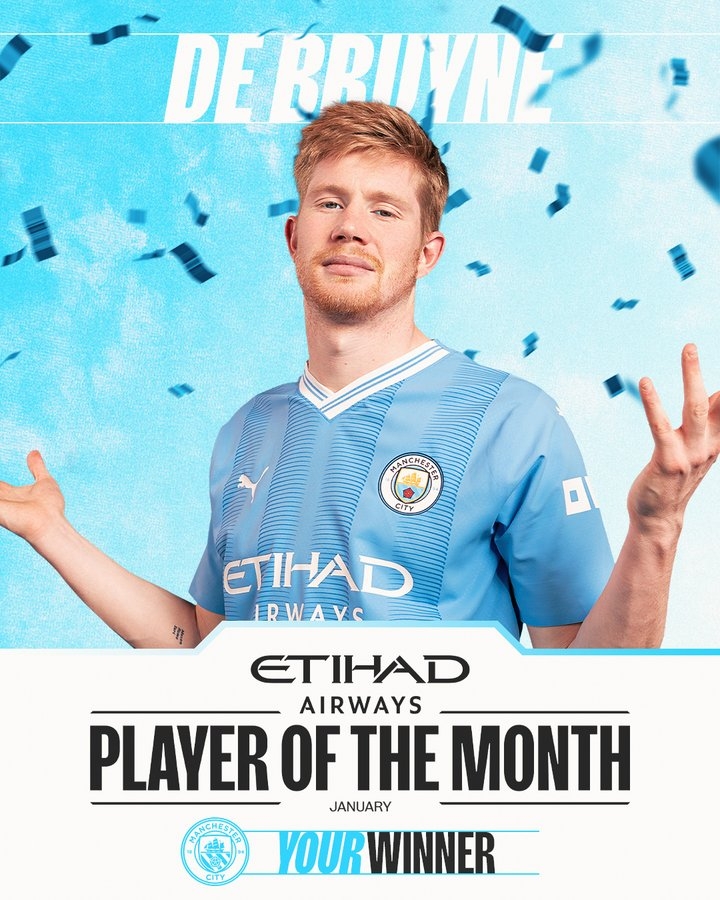 复出后4场1球3助!官方:德布劳内当选曼城1月最佳球员