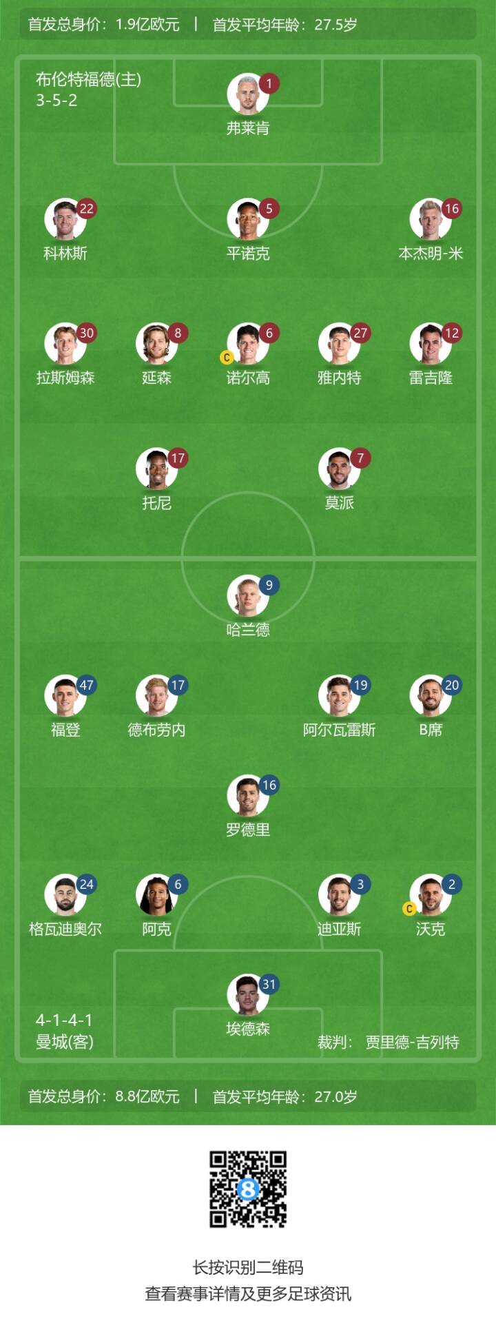 曼城vs布伦特福德首发:哈兰德回归先发,德布劳内、小蜘蛛出战