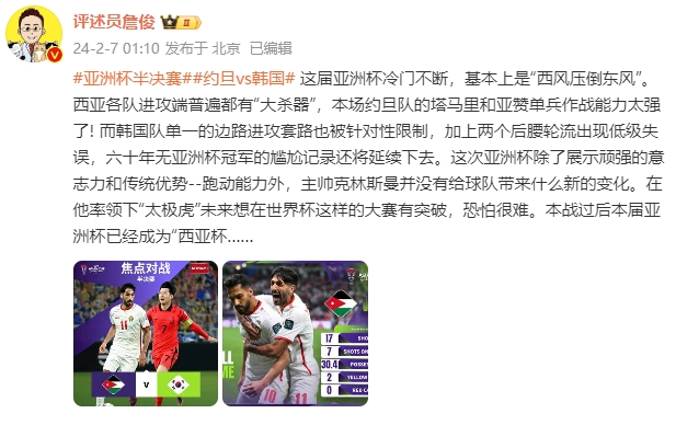 2月7日讯 亚洲杯半决赛,约旦2-0韩国晋级决赛,赛后詹俊对此进行了点评。