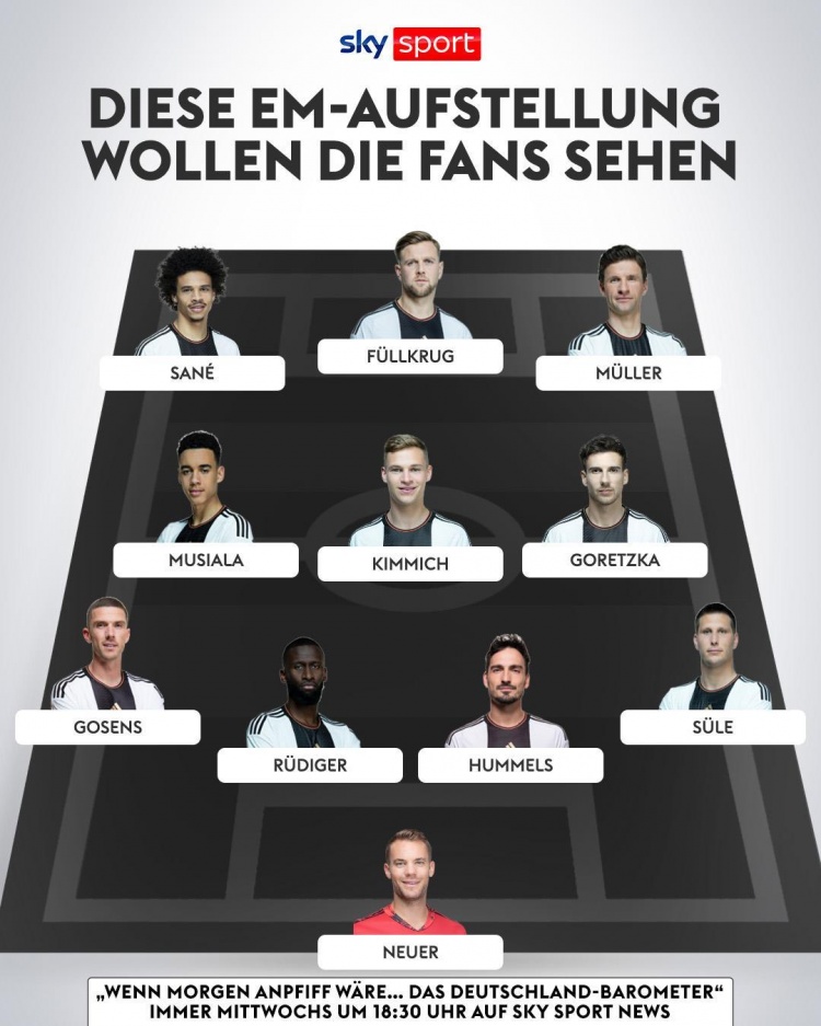 2月9日讯 2024年欧洲杯将在德国本土进行,德国天空体育对球迷进行问卷调查,投票评选德国队在欧洲杯的首发阵容,穆勒、萨内、基米希、胡梅尔斯在列。