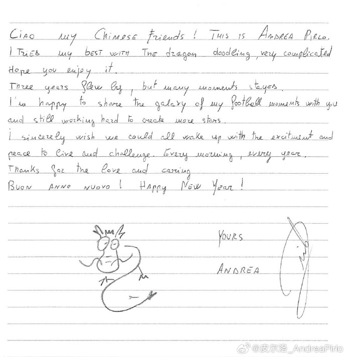 皮尔洛写道:“亲爱的中国球迷朋友们!我是安德烈-皮尔洛,第三次来到微博向大家拜年。