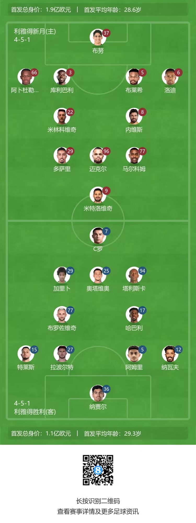 利雅得新月首发:37-布努、66-阿卜杜勒哈米德、3-库利巴利、5-布莱希、6-洛迪、8-鲁本-内维斯、22-米林科维奇、77-马尔科姆、29-萨勒姆-多萨里、96-迈克尔、9-米特洛维奇