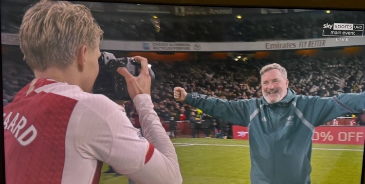 英超第23轮,阿森纳3-1战胜利物浦。赛后,厄德高在球场上庆祝胜利,并拿到阿森纳摄影师的相机,在酋长球场内拍摄庆祝的摄影师。对此天空体育评论员卡拉格表示道:“快下场走进球员通道吧!你赢得了一场重要的胜利,拿到了三分,球队又回到了英超冠军争夺战中,赶紧下场吧,我是认真的。”