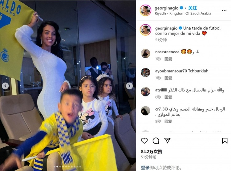 2月10日讯 C罗女友乔治娜更新了社交媒体动态,她写道:“属于足球的一个下午,和我生命中最美好的一切在一起。”在动态中,乔治娜带着孩子们一起观战了利雅得胜利