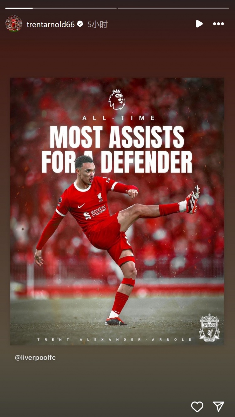 阿诺德职业生涯至今在英超送出58记助攻,成为英超历史助攻次数最多的后卫,他在社交媒体上晒出海报,庆祝达成这一成就。