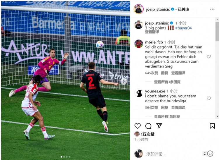 从拜仁租借加盟勒沃库森的斯坦尼西奇在社交媒体上晒出自己的比赛照片,并写道:“重要的3分。”
