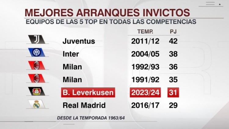ESPN统计了1963-1964赛季以来五大联赛球队赛季开局不败的场次,并列出榜单,尤文以42场居首,勒沃库森31场排名第五位。