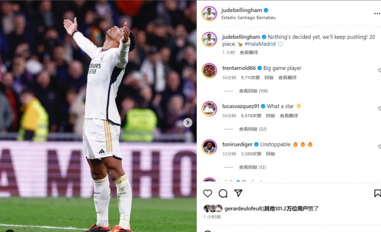 赛后贝林厄姆更新了社媒:什么还没有决定呢,我们会继续努力!打进20球