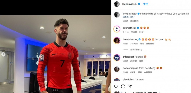 赛后,热刺后卫本-戴维斯晒出在更衣室身穿孙兴慜韩国队7号球衣的照片,并表示道:我想我们都很高兴你回来了,伙计@孙兴慜。