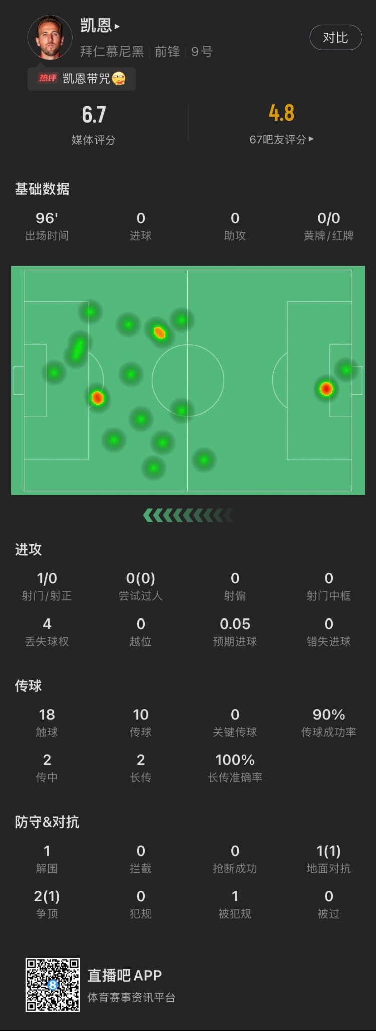 孤立无援凯恩数据:触球18次,仅1次射门0射正,贡献1次解围