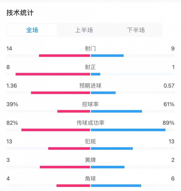 药厂3-0拜仁全场数据:射门14-9,射正8-1,中框2-0