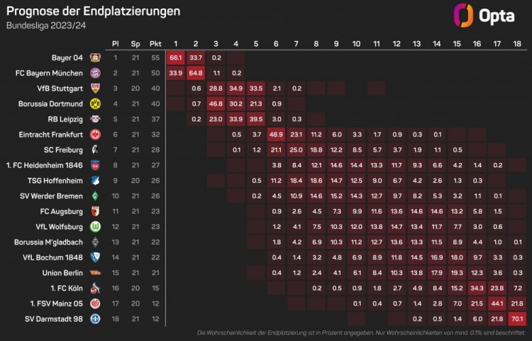 Opta本赛季德甲最新夺冠概率:勒沃库森66.1%,拜仁33.9%