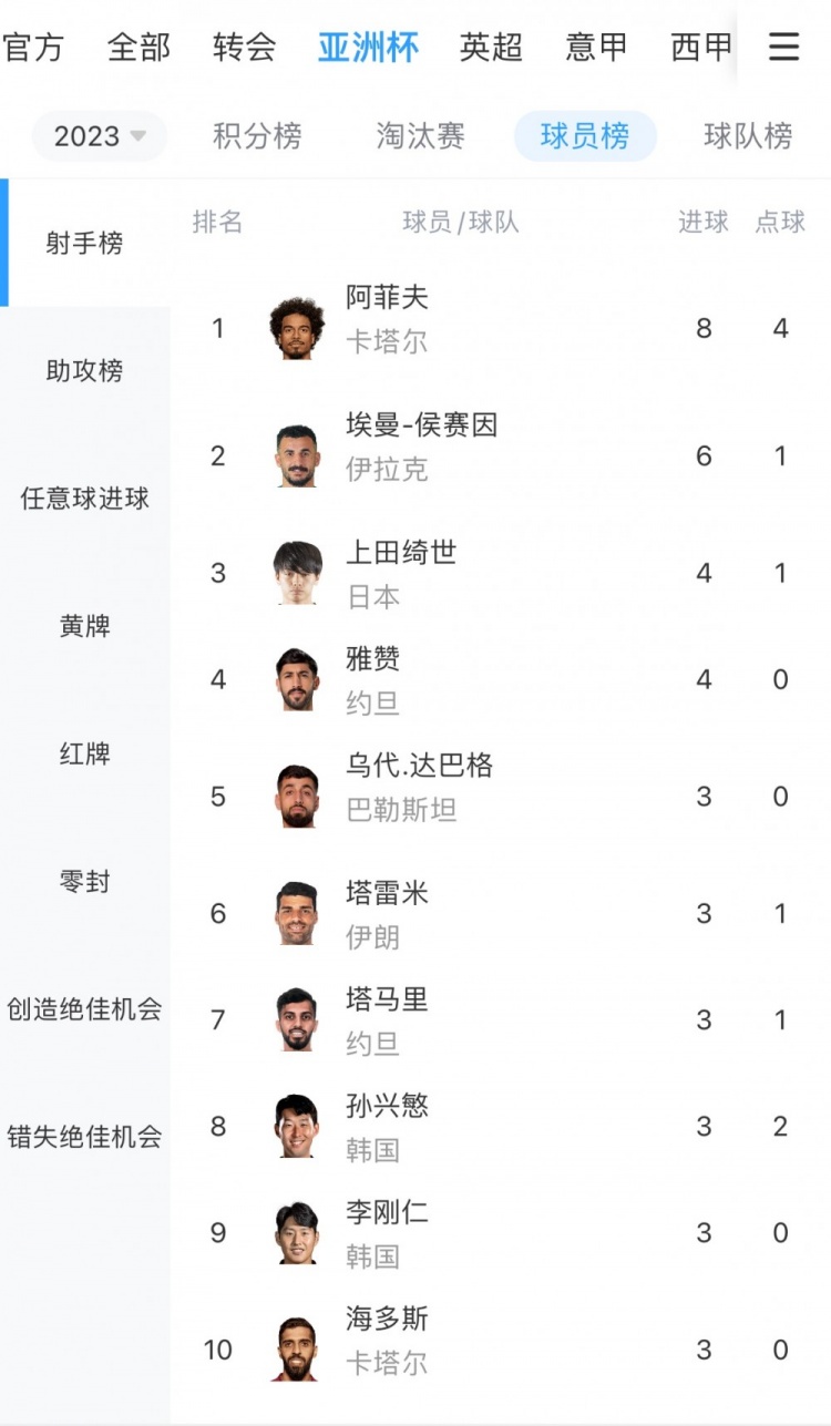 亚洲杯射手榜:阿菲夫8球获金靴,埃曼-侯赛因、上田绮世列2、3位