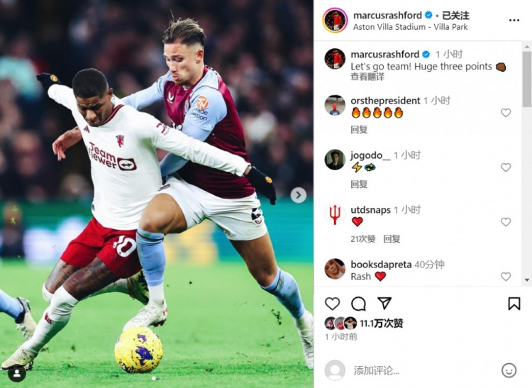 拉什福德晒出了比赛照,并配文:继续加油曼联!重要的三分