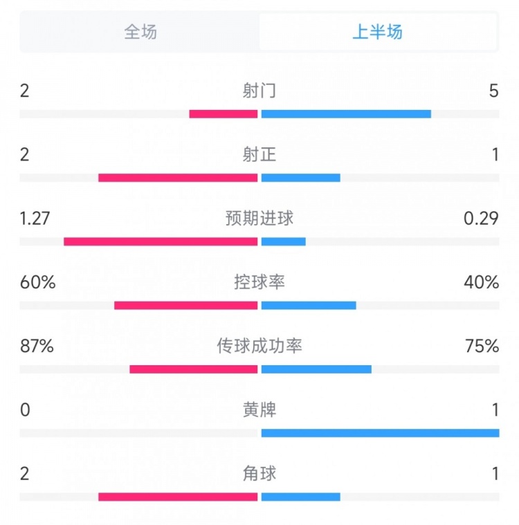 巴萨vs格拉纳达半场数据:射门2比5,射正2比1,控球率60%比40%