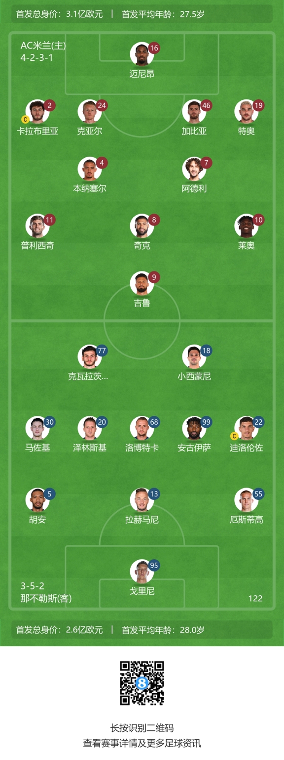 AC米兰vs那不勒斯首发:吉鲁、莱奥、普利西奇先发,K77出战
