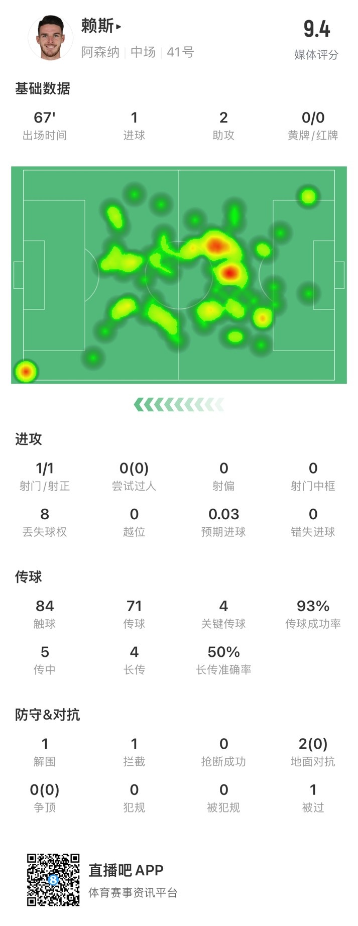 太强了!赖斯本场数据:1射2传,预期进球0.03个,获评9.4分