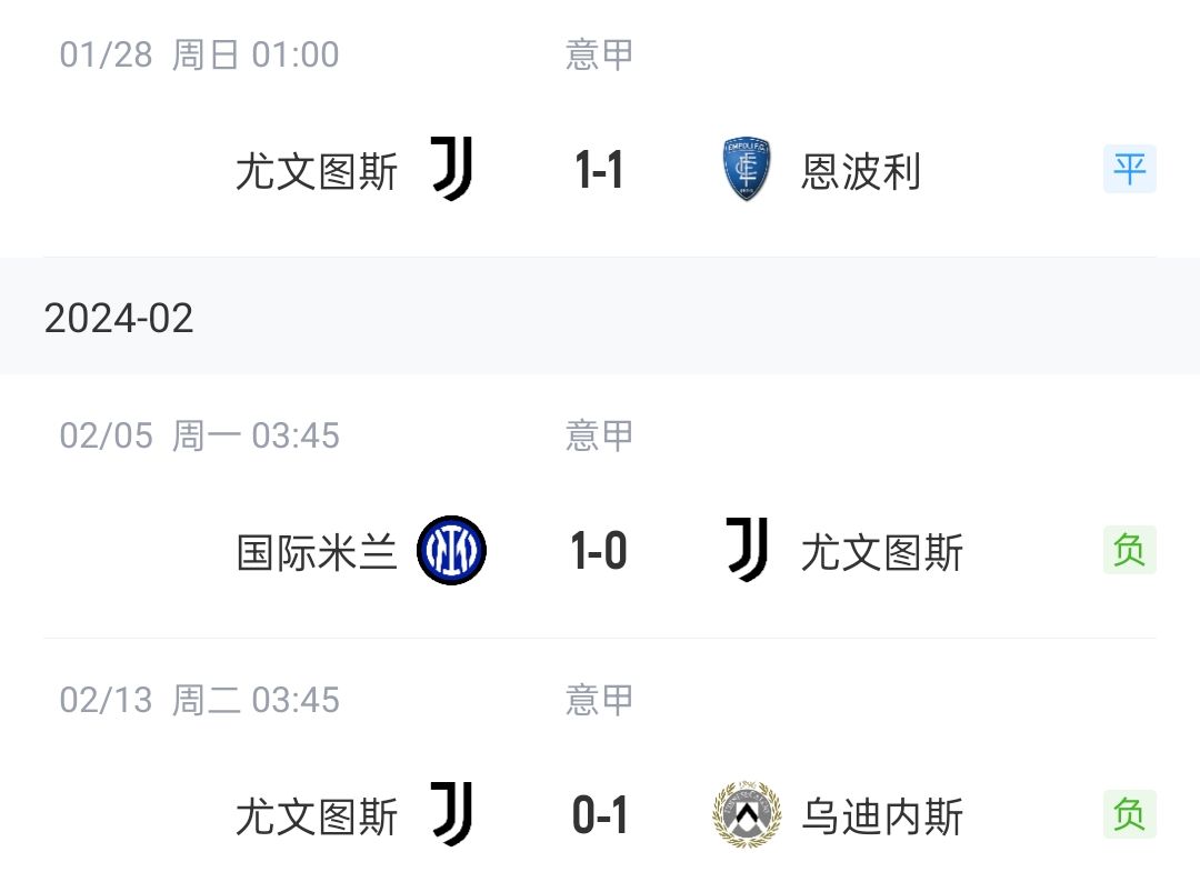 最近三轮联赛,尤文1平2负只拿到1分,战平下游的恩波利、输给争冠对手国米、输给下游的乌迪内斯。