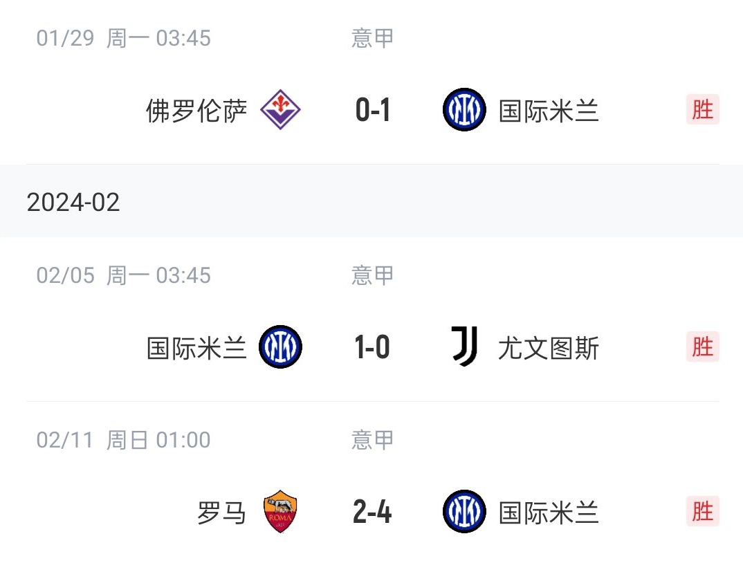 同期国米3轮全胜,并在争冠的直接对话中击败尤文,客场逆转罗马。