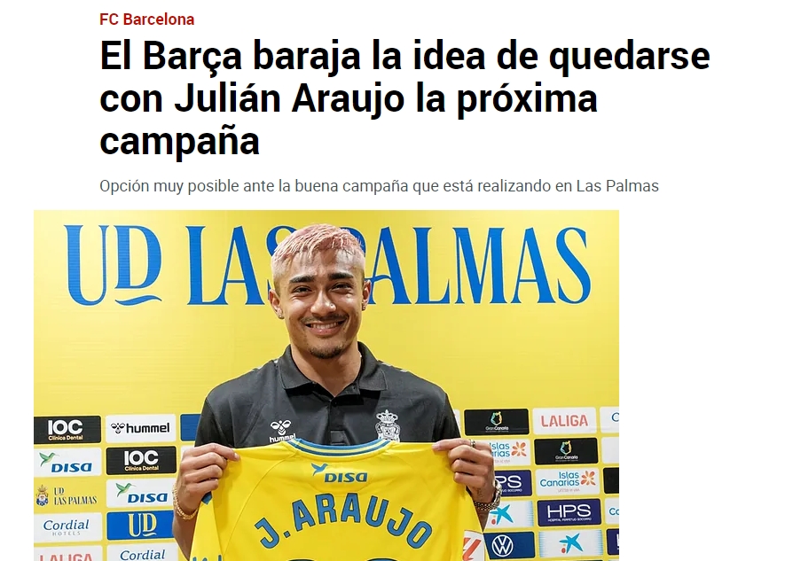罗贝托留队的可能性几乎被排除,他的合同将在6月到期,俱乐部的想法是结束双方之间的合作。因此,巴萨在考虑一些年轻球员,其中之一是朱利安-阿劳霍。目前这名球员被租借到拉斯帕尔马斯并且表现出色,博扬正在关注着他,巴萨管理层正在认真考虑新赛季将他纳入一线队。