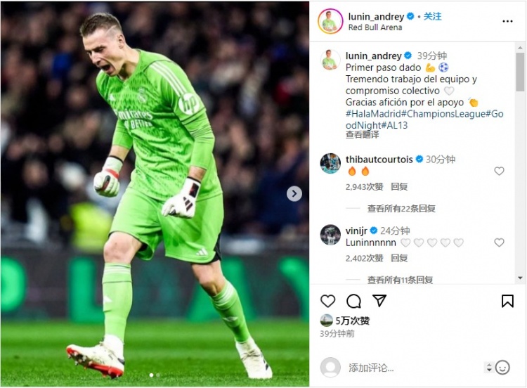 库尔图瓦、维尼修斯、巴斯克斯、马塞洛、克罗斯、津琴科、久保建英等球星都纷纷在评论区留言,对卢宁进行称赞。