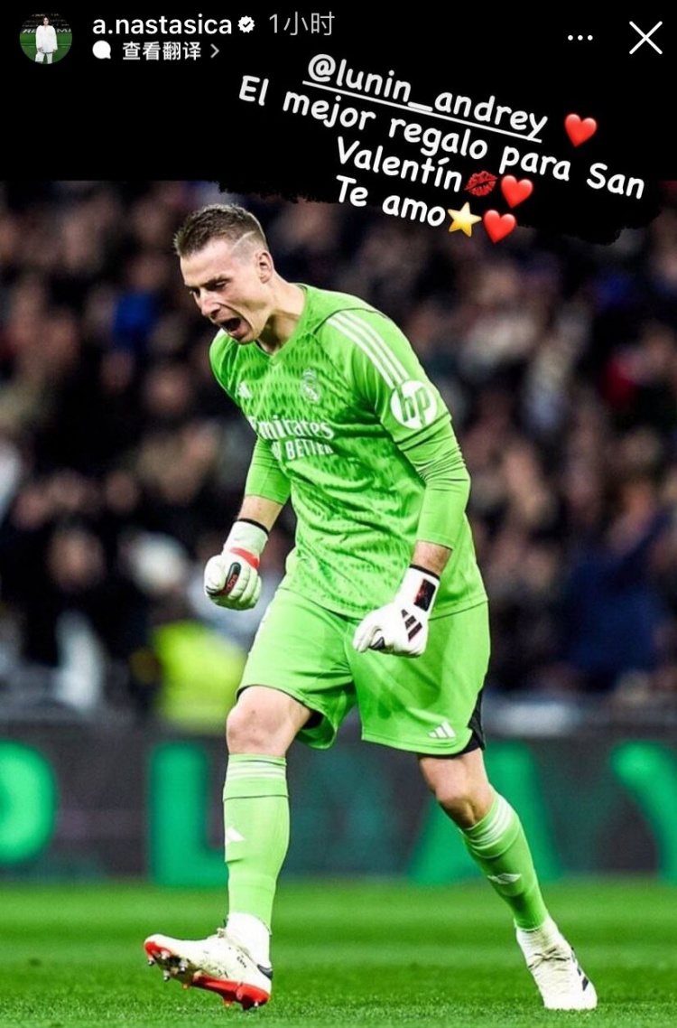 2月14日讯 欧冠1/8决赛首回合,皇马客场1-0击败莱比锡。本场比赛,卢宁发挥神勇,9次扑救力保球门不失。赛后,卢宁的妻子阿纳斯塔西娅也称赞了他的表现。