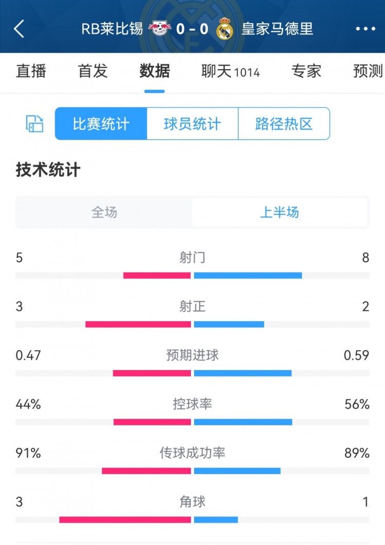 皇马0-0莱比锡半场数据对比:射门8-5,射正2-3