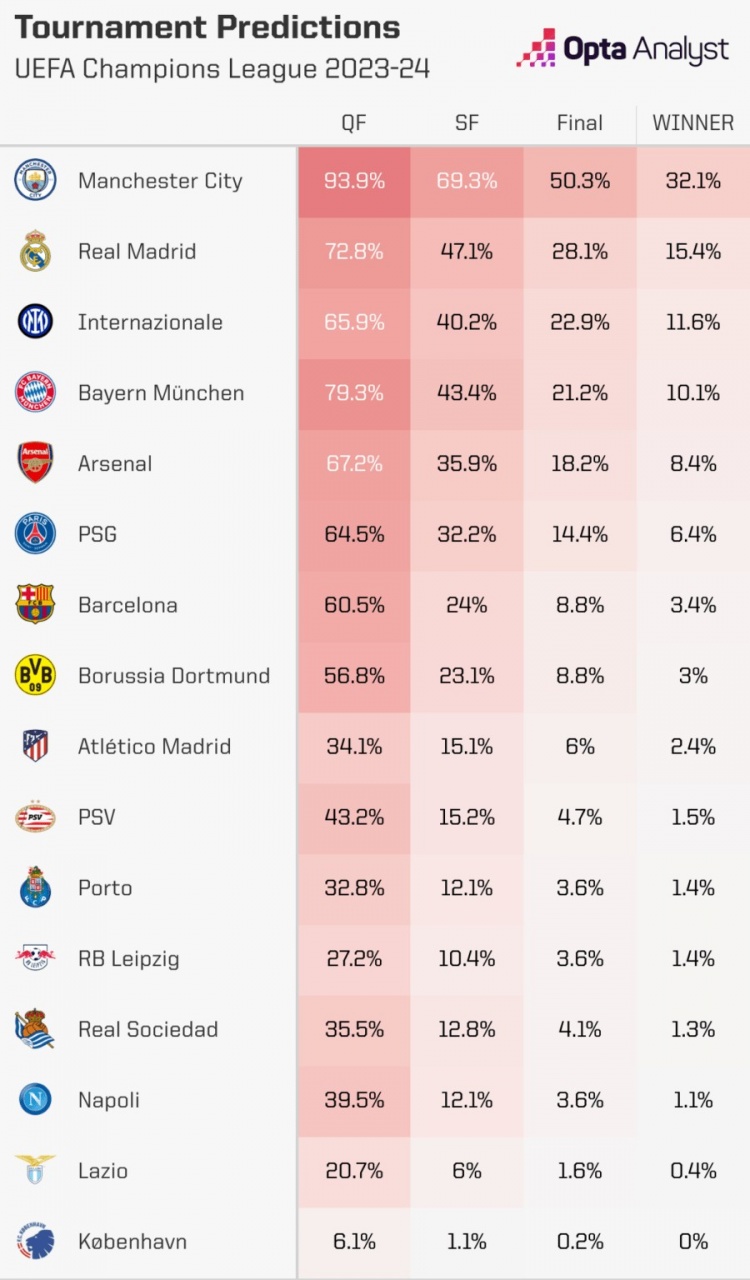 本赛季欧冠夺冠概率:曼城居首,皇马国米拜仁分居二三四位