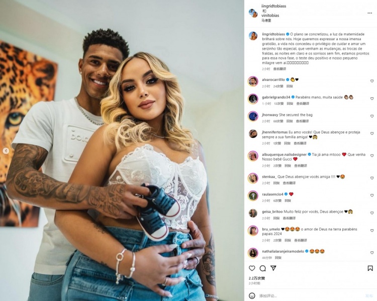 维尼修斯-托比亚斯晒出妻子因格丽德-托比亚斯的验孕结果和一双婴儿鞋,并与妻子联合发文,写道:“计划已经实现,母爱之光将照耀我们。今天,我们想表达我们无比的感激之情,生活赋予了我们照顾和爱护这样一个特别的小生命的特权,但愿这些变化、尿布的更换、不眠之夜和无尽的微笑都会到来,我们已经为这个新阶段做好了准备,验孕结果呈阳性,我们的小奇迹即将到来。”