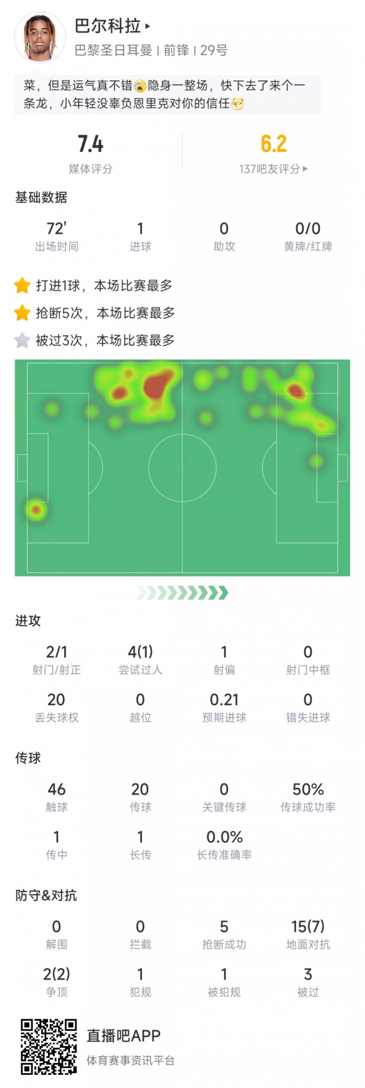 巴尔科拉本场数据:5次抢断全场最多,斩获生涯欧冠首球