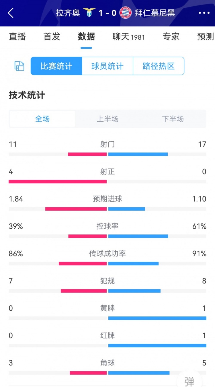 拜仁0-1拉齐奥全场数据:拜仁17射0正,蓝鹰11射4正