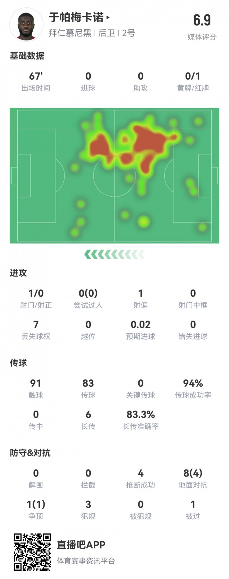 于帕本场数据:1次送点,4次抢断,5次成功长传,获评6.9分