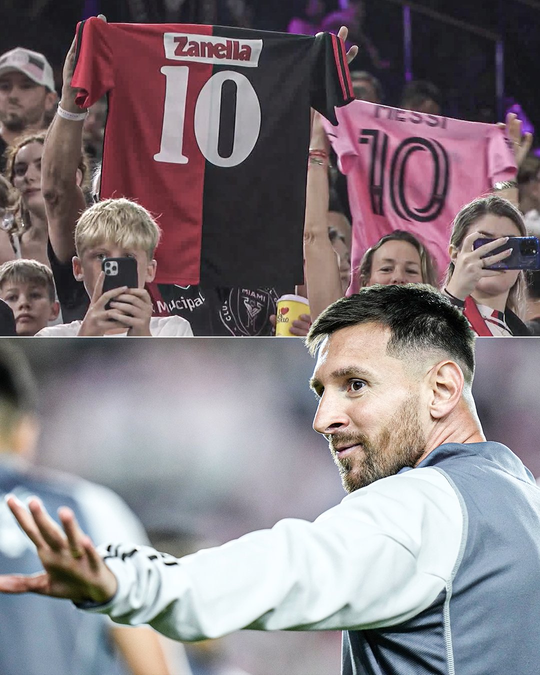 2月16日讯 迈阿密国际友谊赛主场迎战纽维尔老男孩,梅西面对老东家首发,现场球迷高举梅西迈阿密、纽维尔的10号球衣。