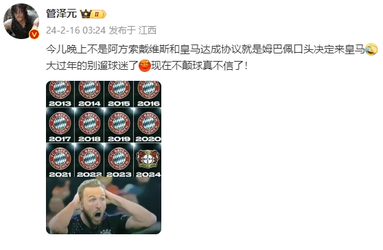 对于姆巴佩和戴维斯与皇马的传闻,管泽元发文:“今儿晚上不是阿方索戴维斯和皇马达成协议就是姆巴佩口头决定来皇马,大过年的别遛球迷了