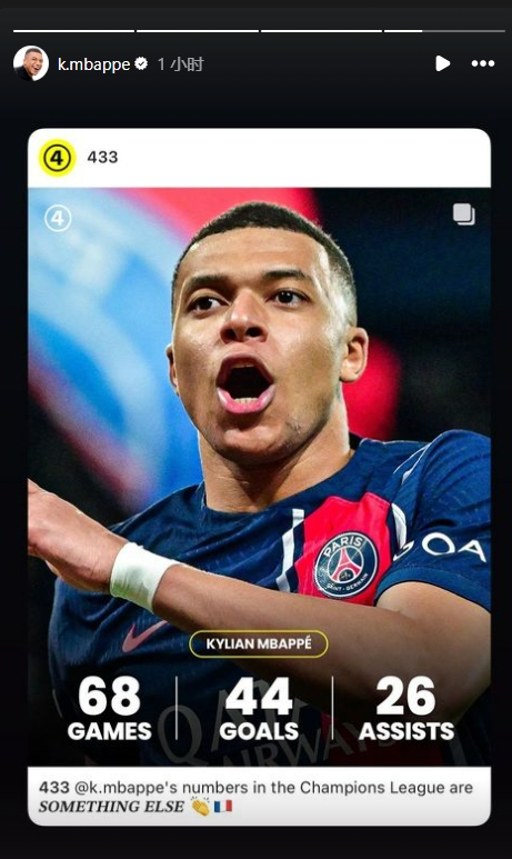 姆巴佩在自己的ins转发了433盘点的个人欧冠数据:68场比赛,打入44球并贡献26次助攻。