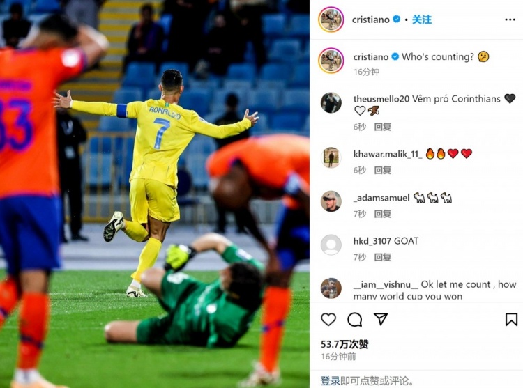 2月16日讯 在昨天结束的亚冠1/8决赛首回合中,C罗打进制胜球,利雅得胜利客场1-0击败费哈。赛后,C罗晒出了自己庆祝进球时的画面,并配文:谁在数?