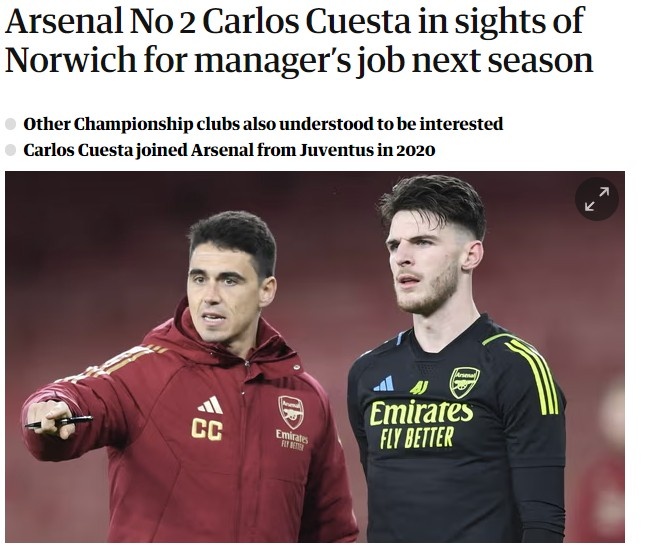 2月16日讯 《卫报》消息,英冠诺维奇有意邀请阿尔特塔的28岁助教,卡洛斯-奎斯塔担任球队主教练。