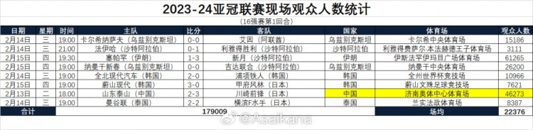 2023-24亚冠联赛现场观众人数统计(16强赛第1回合)