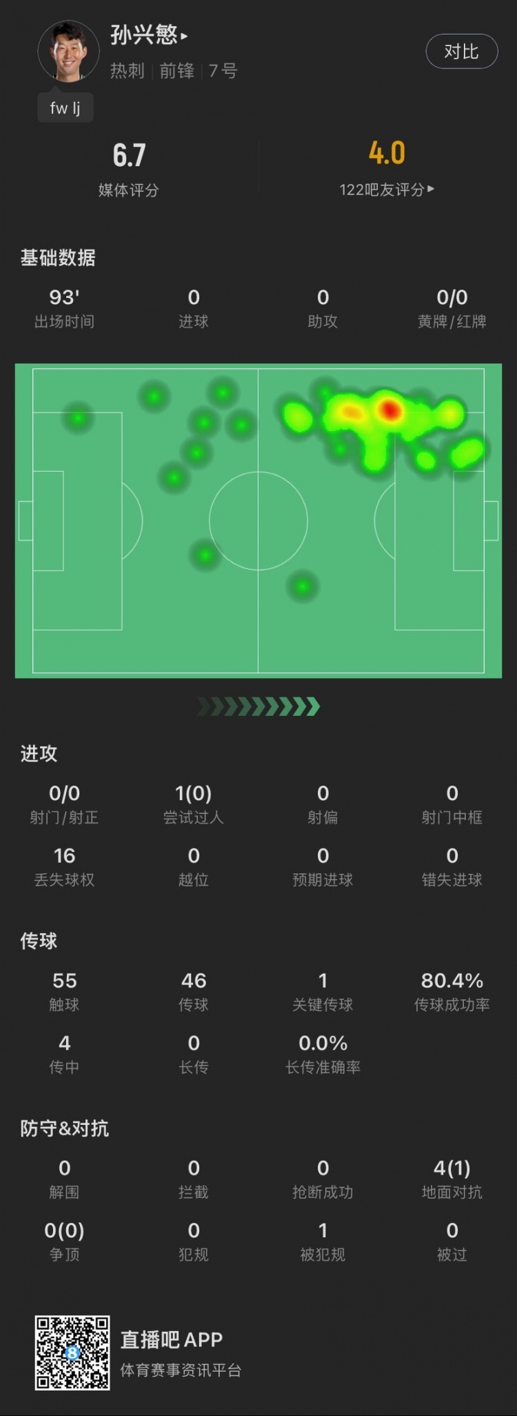 2月18日讯 在刚刚结束的英超第25轮比赛中,热刺主场1-2不敌狼队,本场比赛,孙兴慜首发出战打满全场,但状态不佳,多项数据挂零,获评6.7分队内最低。